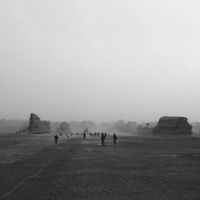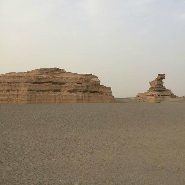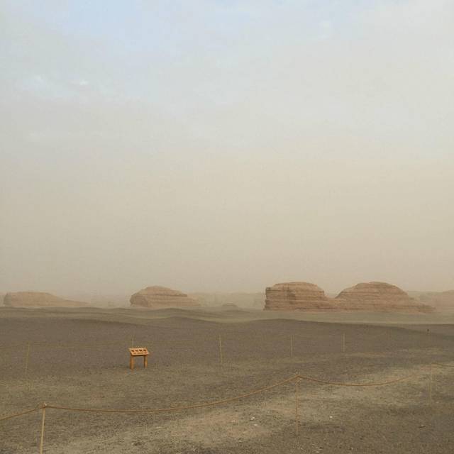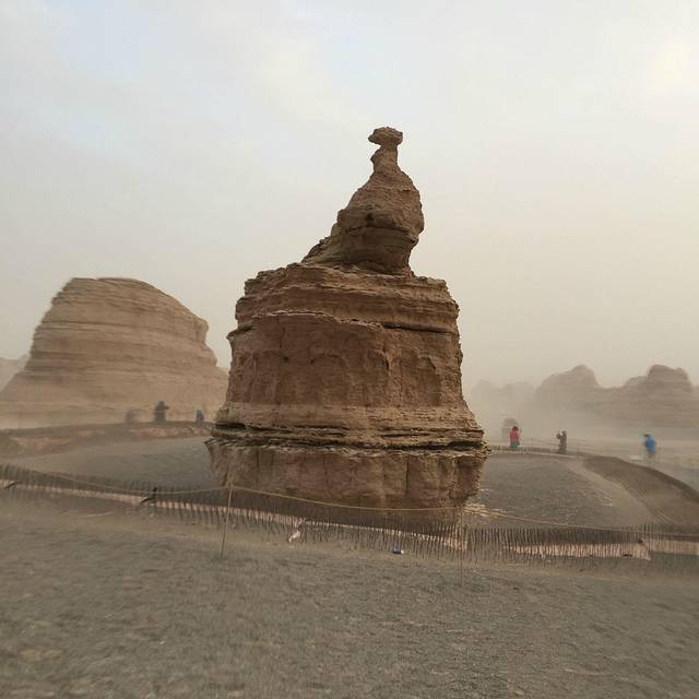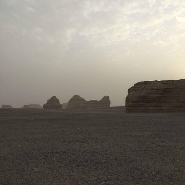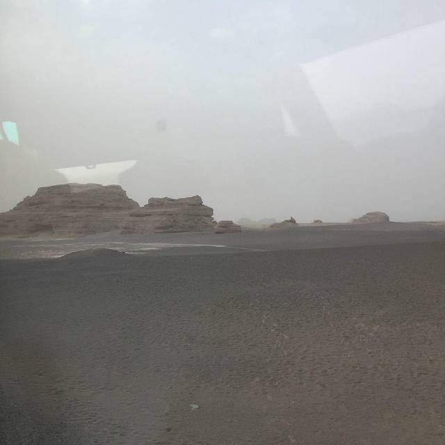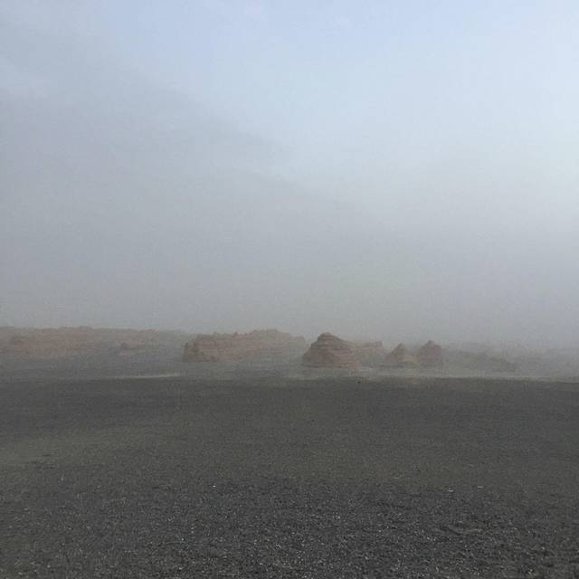 来敦煌之前,最期待的就是雅丹(比对莫高窟期待~),还想着看看美丽的日落之景。结果去雅丹的路上就发现情况不对,风越来越大,看到远处的沙尘也扬起来了。到了之后就只能把自己全副武装起来。雅丹魔鬼城参观的景点有四处,都有景区巴士带过去。其实天气好倒是也可以走路(单程10几公里吧......)那天天气太恐怖了,导游基本上让大家每个景点逛10-20分钟,结果大家都是拍了个照就回车上呆着了。我没经验,单反进了沙子,衣服口袋没拉好全都是沙子,鞋子围巾里面都是......