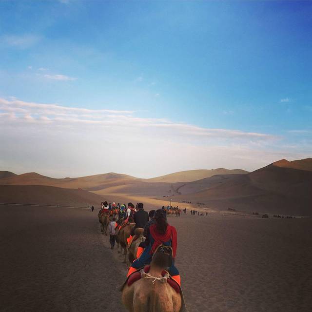 去鸣沙山最好的时间就是傍晚,可以看落日,再呆一下下可以看到繁星~所以一般下午四五点过去就可以了。9点回来还有公交车。我去的那天运气不错,在坐骆驼的时候还看到了火烧云。后来自己又爬了一遍山,可惜相机没电没拍到星空。真的很美。