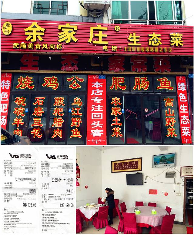 收拾桌子的那位就是我一直提到的老板,但说实话,我也不知道是不是老板,嘿嘿~还有就是,她家的饭菜真的没有想象中的那么贵,人均消费并不高,我们的两顿饭才花了这么点钱,吃的还那么好、那么饱!最最重要的是,在重庆这个随处都不能刷卡的地方,在这个山沟沟里面,她家居然是可以刷卡的!