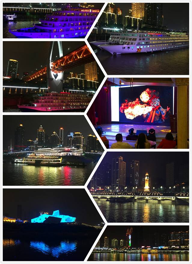因为开船的时间比较晚,两岸的灯火通明,就像我们第一天在一棵树观景台看到的一样,不同之处在于,一个是远眺、俯瞰,一个是置身其中,两种观赏的方式各有各的美,难分伯仲。船上让我比较印象深刻的是洪崖洞夜景,这次算是看到全景了,真的是非常漂亮,美的有些不真实。