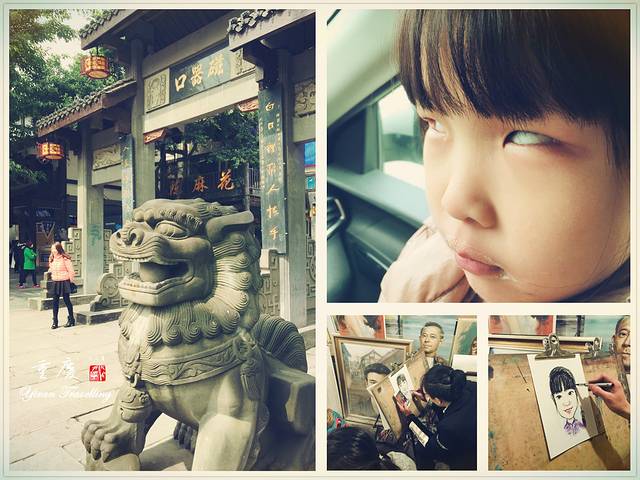 终于排到了我们,老板选择的是漫画款的图,老板推荐给我们的画师是一位苗寨‘王子’,人长得蛮帅,据老板说,这是唯一一个有天赋接他班的人。经过几十分钟的等待,小主的漫画版画像出来了,平心而论,真的不如我们之前在淘宝上花30块钱给她画的漫画传神。最悲催的是,等到我们画完,已经过去了大概两个来小时的时间,而刚开始承诺的是10分钟画完……于是磁器口我们就没能逛,而是直接去吃饭了,只是在出口附近买了些陈麻花带回来了。朋友在我们画像的时候去里面逛过了,就像之前做攻略时了解的一样,逛过宽窄巷子、锦里之后,磁器口其实没有什么必要再来了。