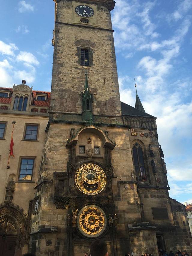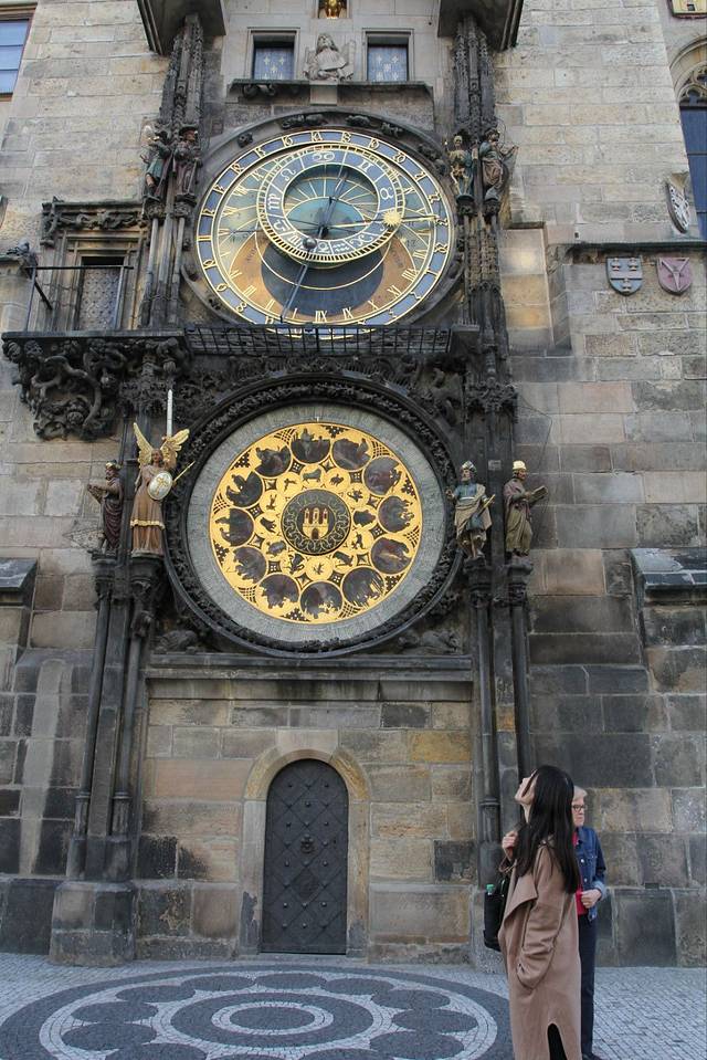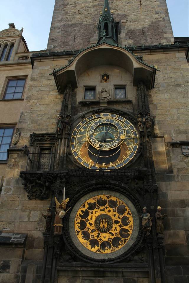 布拉格天文钟也称“布拉格占星时钟”,安装在老城广场的老城市政厅的南面墙上,至今走时准确。钟楼建于1410年,根据当年的地球中心说原理设计,上面的钟一年绕一周,下面的一天绕行一圈,每逢整点,十二尊耶酥门徒从钟旁依次现身,6个向左转,6个向右转,随着雄鸡的一声鸣叫,窗子关闭,报时钟声响起。