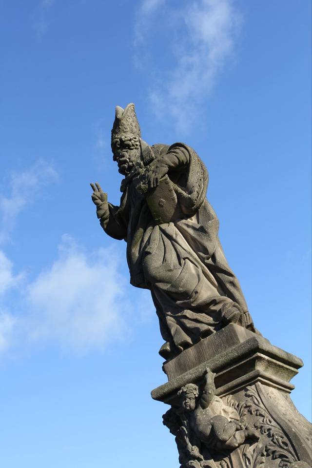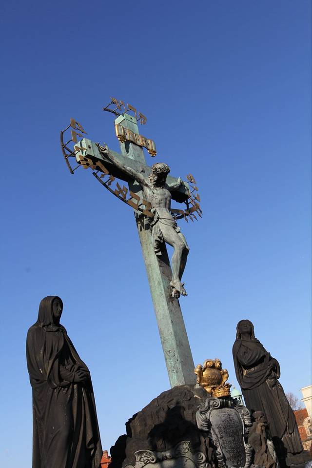 桥右侧的第8尊圣约翰雕像,是查理桥的守护者,围栏中间刻着一个金色十字架位置,就是当年圣约翰从桥上被扔下的地点。
