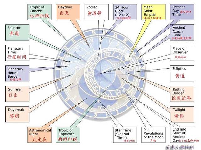 布拉格天文钟由三个最主要的部分构成:“天文表盘”、“耶酥和十二信徒”、以及“日历钟盘”。天文钟盘,代表着太阳和月亮在天空中的方位,并能显示各种天文细节;“行走的使徒”,一个发条装置可以每隔一小时显示使徒和其他移动的雕像;一个用代表月份的纪念章所组成的日历表盘。有兴趣可以上网搜,真的很NB。