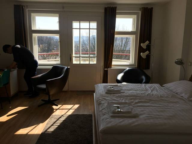CK最超值的是这家民宿,Hotel Garni Villa Beatika,booking 9.5分~ 到处都是披头士装饰画,房间名也是披头士成员命名的。大约我们预定的早,老板给了个三楼的阳台房,房间超大卫生间超大,还有个大阳台~ 而且是全程最便宜的旅馆70€/晚。