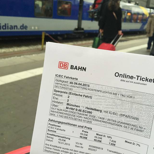 第二天一早坐DB火车去海德堡。DB是德国铁路最大运营商,有官网提前订票很方便,网上支付,订单打印出来随身带着就能上车,车上会有工作人员来验票,给他看打印的订单和支付用的信用卡。DB一般不订座,上车随便坐就行。