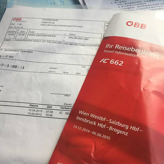 第四天从维也纳坐奥铁OBB到萨尔茨堡,奥铁相当准时,到达和出发时间分毫不差,这比DB德铁好多了。。。 而且上车还会给你发车次时刻表,标注每一站的停靠时间、站名、可以转乘的列车,非常方便。 同样也是提前打印好点子车票,上车会有人检票。