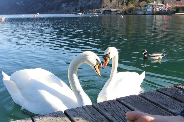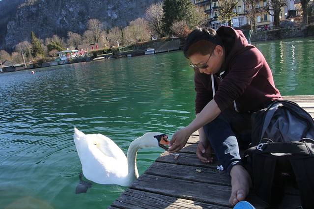 下山后不舍得离去,到湖边喂天鹅。天鹅一点不怕人,自己大老远游过来讨吃的~
