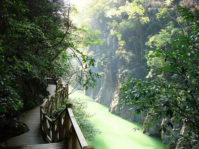 南江大峡谷地处贵州高原中部的开阳县,距省会贵阳五十四公里。以发育典型、气势宏大的喀斯峡谷风光和类型多样、姿态万千的瀑布群落为特色,风乐旖旎,景象万千。峡谷全长四十多公里,峭峰顶立,最深处达三百九十八米。