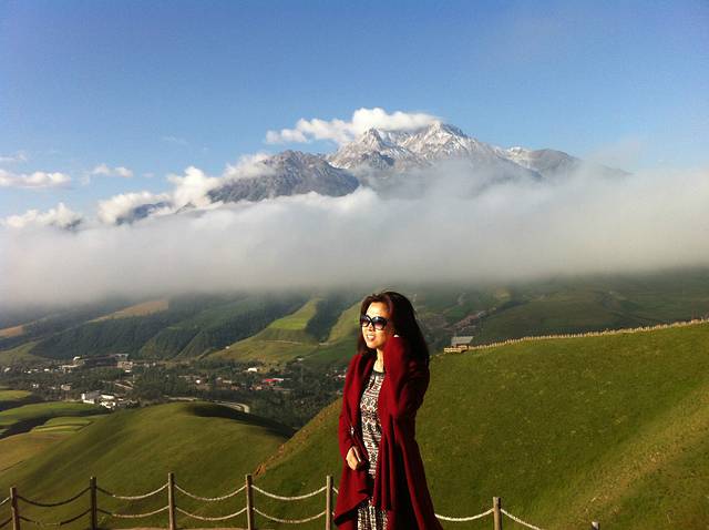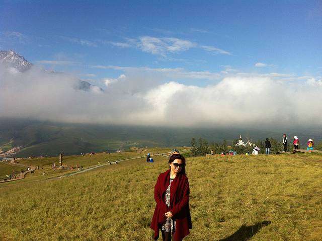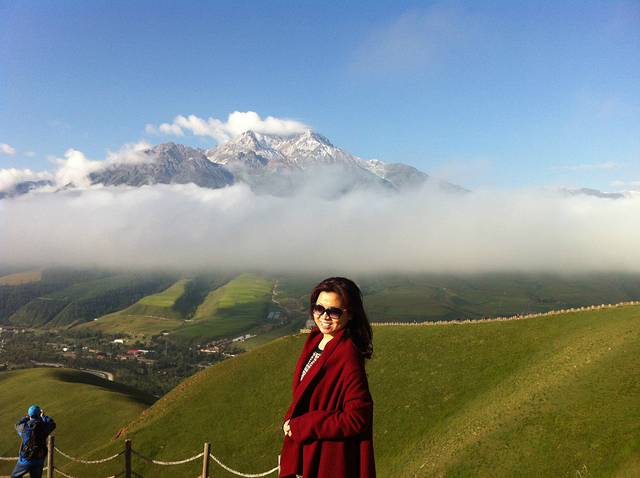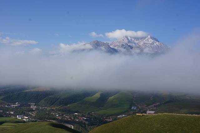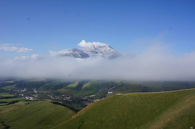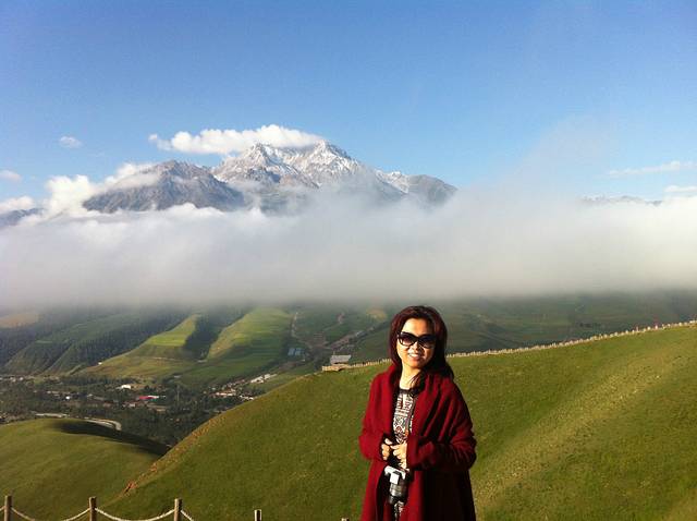 牛心山海拔4600多米,终年大雪覆盖,我这次很幸运看到了这么美的牛心山,我不知道这一条白是不是云海?暂且称她为祥云吧,不是每一个人多这么能有福遇到的,我却遇到了。