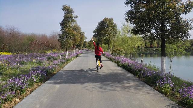 绿道边的景色要比公路边的好看很多,起初是开满路边的二月兰,后来是成片的油菜花,花田的对面就是一个小池塘。自然景色美极了,加之几乎没有其他游客,我们肆意的在路中间、花田里、池塘边各种摆拍,非常尽兴。