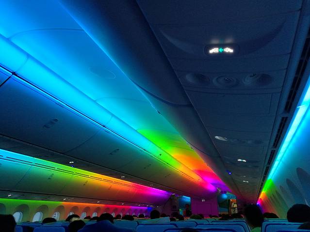 虽说是新航的廉价航空,但是我们感受到的绝对不是廉价航空的待遇,由于小朋友比较多,又正好的晚上的航班,快要起飞时机舱里亮起了彩虹,心情都变得美丽了。