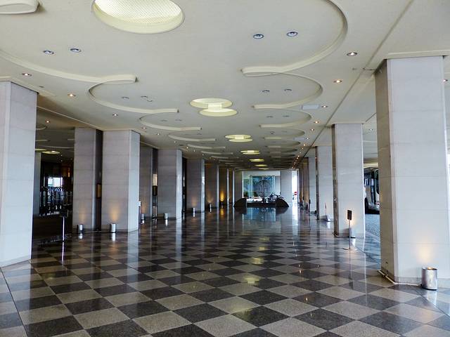 酒店门前双层通道,很宽敞。酒店服务员随时欢迎各位光临。大堂宽敞明亮,中间玻璃水幕下,摆放着极具民族特色的装饰物。大堂有几位服务员站立,见面就鞠躬,虚伪的热情,