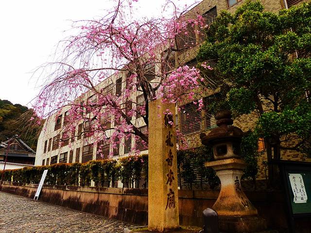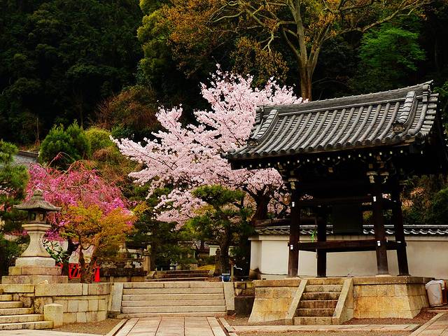 在归来途中,无意中发现路旁一个小庙,非常雅致,停车进去看看。这是一个叫做法金刚院的寺庙,据记载,最早可追朔到平安时代(794-1192年)初期,原来是一位大臣的别墅,1279年改为寺庙。它是以净土式庭园闻名遐迩,现为国家特别名胜。寺内景观别致,刚一进入庭园,首先映入眼帘的是一株盛开的樱花,其树冠的很大,而且形状极佳。院内还有很多植物,一看就是精心设计和打理。顺着小径绕池塘边,走到池塘对面,樱花、庙宇映在水面,使这小小的i法金刚院,更加古朴妩媚。