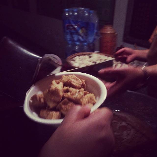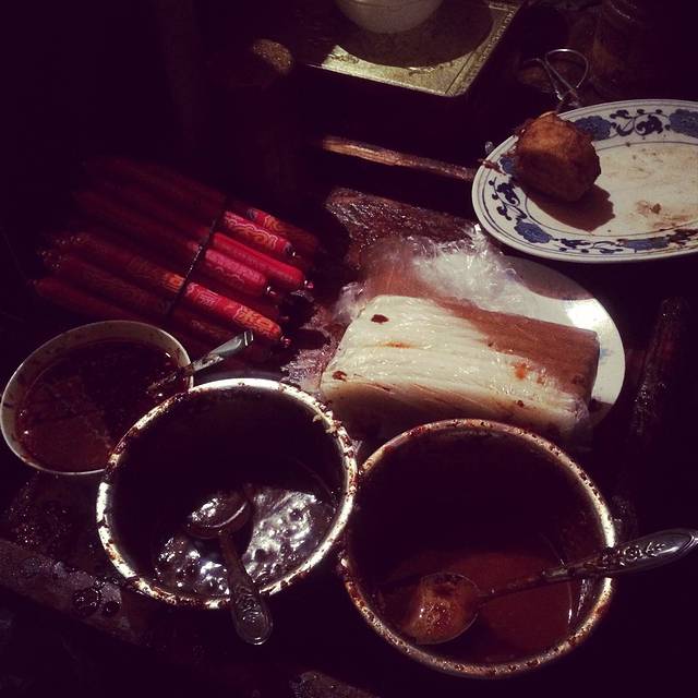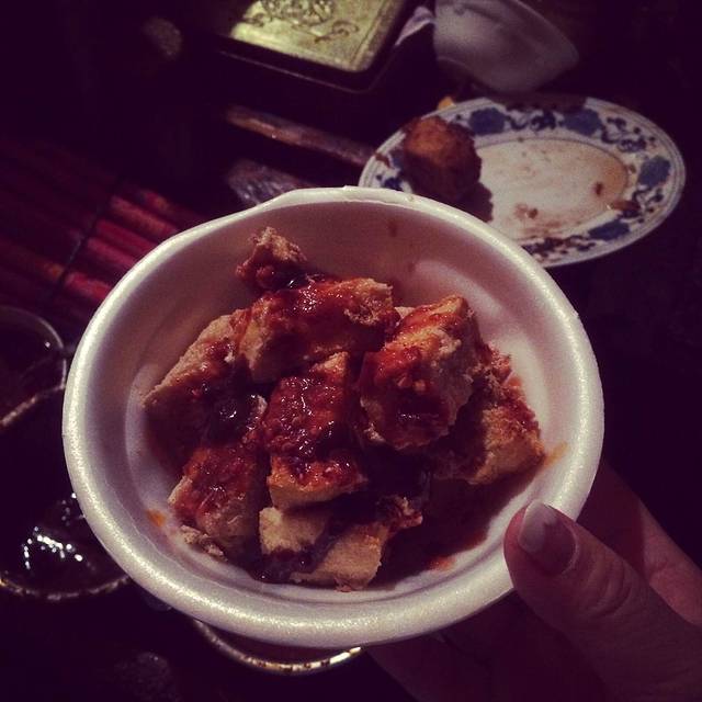 深夜街巷里家家基本都黑了也没几家店还开着,偶遇老奶奶的臭豆腐摊,酱没有了她就穿过街巷回家去拿,摊子直接就留给了我们。