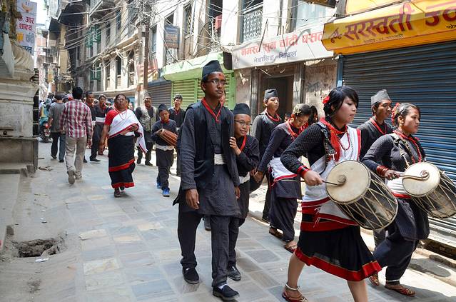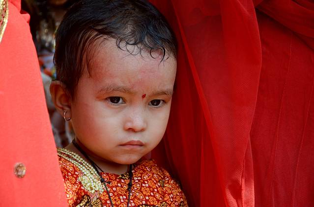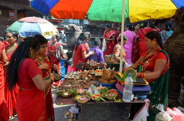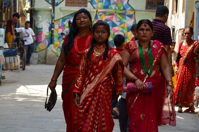 从泰米尔到杜巴广场也不远,走路过去就行了。广场对外地人还要收门票,好吧,我们从旁边的巷子绕进去了。看起来今天是什么节日,好像是妇女节,每个女人都穿着大红色的纱丽,打扮得漂漂亮亮的。