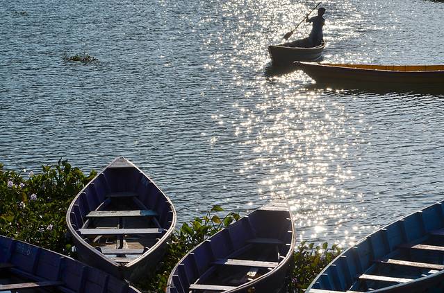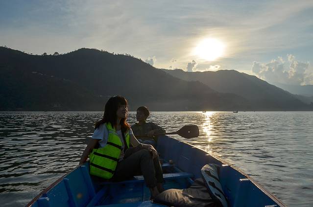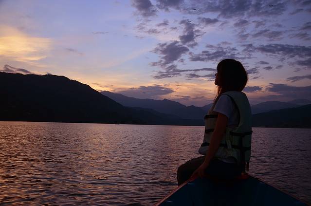 博卡拉太闲了,下午去费瓦湖划船,如果不怕晒的中午也可以去。一个船800尼币漂一天,划船最好不要全是女生吧,还是有点累的,除非你是像玲珑一样从318骑行过来的女汉子。我、小业、玲珑三人一个船,划船的事就交给小业和玲珑了,我就负责坐。