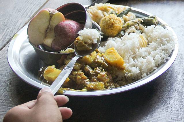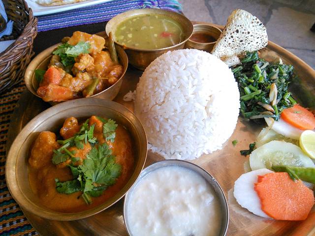 这就是尼泊尔餐了,当地人吃饭真的是用手抓的。他们不用筷子刀叉,把汤倒在饭里,用手拌一拌,然后用手抓来吃。还好,我看了一下,他们吃完都会洗手的。