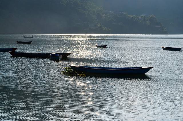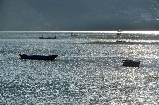 微波粼粼的费瓦湖还是很美的。放下船桨,任它漂。