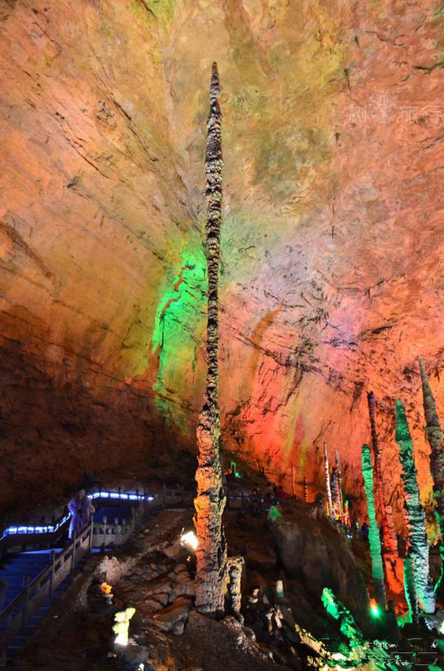 定海神针,黄龙洞中最为独特的标志性景点之一,高约20米,两端粗,中间细,最细处直径只有10厘米的钟乳石柱,据推算已生长了二十万年,黄龙洞为此投保了一亿元保险金。