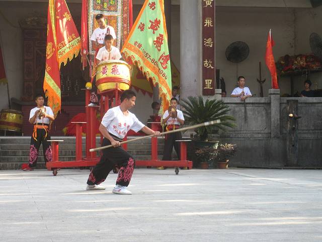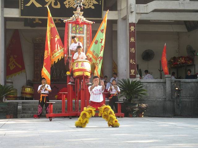 到了山脚,走过一个湖,就到了景区南门,坐樵15路,到黄飞鸿武馆门口。人少公交司机会甩站的,要下提前按铃。15:00多一点,正好。先看看展览。