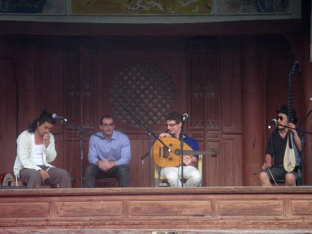 回四方街,发现戏台上有人演出。至少中间两位看着像老外。