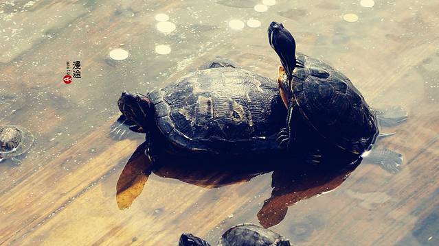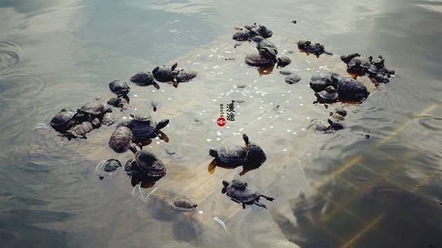 池内有许多乌龟,都慵懒的躺在岩石上晒着太阳,鲶鱼们争先恐后的涌至人群投食处,无数张大嘴在水中张着,贪婪的争夺着食物。