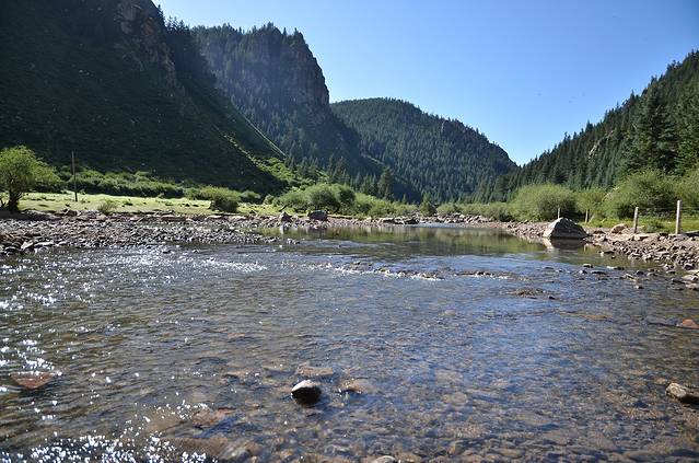 “窟窿峡是一条狭窄幽深的峡谷。位于山丹县军马一场驻地九碗泉的东南面。她的得名是因为古时这里有一种奇特的地貌:碧绿如茵的草地上每隔三五步就有一个陷阱般的"窟窿"。俯身下瞰,深不见底,清澈的水柱汨汨上冒又不见流出,原来水在地下窟窿中奔腾下泻,发出的轰隆声,山鸣谷应,十里外都能听得见。当地人把这个峡谷称为窟窿峡。”