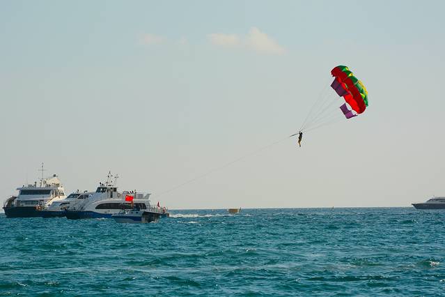 早上9点到达半山半岛帆船港,预定的潜水,先在平静水面做简单的培训,然后到开放水域进行潜水,下午2点到达亚龙湾,真是人山人海,从沙滩向海中央延伸,到处都是人,不过这里的海水也是很好的,清澈浪小。晚上第一市场梅姐川味晚餐,后骑电动车前往临春岭森林公园欣赏三亚夜景