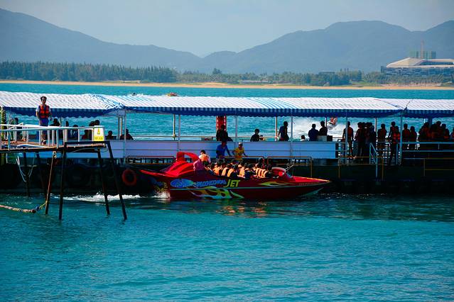 前往蜈支洲岛的登船地点位于海棠湾的后海村,从游客中心购票后乘船约15分钟便能等到,但需要注意的是虽然路上的时间不长,但要是赶上旺季等待的时间要比乘船的时间多上很多。岛上有两个码头,4月下旬到9月下旬使用的位于岛北的夏季码头和9月下旬到4月下旬使用的位于岛西的冬季码头。
