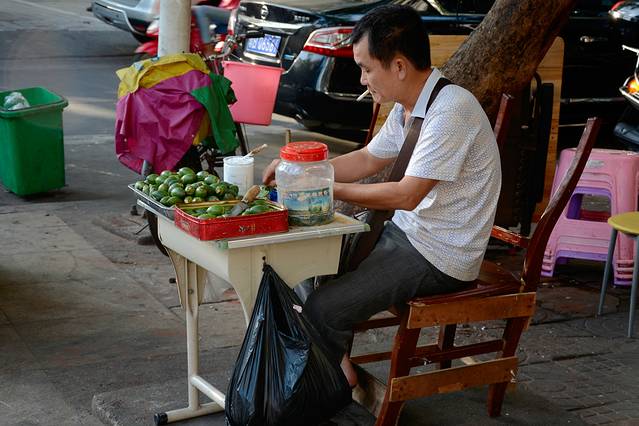 回到市区看到一位卖槟榔的大叔,只看他将槟榔切开,然后用涂了白粉的叶子包好,放到一边,有人买就把包好的卖个他。