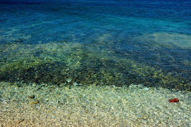海水不深且非常清澈,挽起裤脚可以向里走出很远