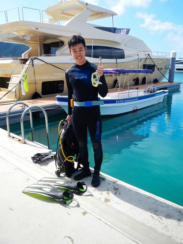 我来半山半岛当然不是来学怎样驾驶帆船的,我之前在网上报了一个这里的潜水体验可,其实这是一家主要进行PADI潜水课程培训的机构,我的体验只有两个小时左右,首先是进行简单的书面学习,然后签个免责协议书,之后有专业的教练开着电瓶车带我到半山半岛酒店的泳池进行平静水面的练习,学习基本的潜水知识,简单的水下手势,还有一些潜水的技巧,最后是到半山半岛的港口进行开放水域的潜水体验。最后会发一个象征性的证书最为纪念。
