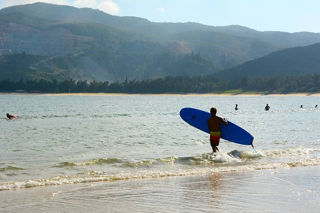 这里也是初学冲浪的还地方,到处都是穿着大裤衩,身材结实的帅哥抱着一块冲浪板冲向大海然后游向远方,乘着浪,踩着板,有动作娴熟的,也有还没站稳就跌落的