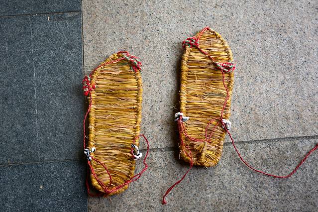 这里有个小贴士,选草鞋的时候一定要选择一个比你平时穿大一码的鞋子,刚穿上可能会觉得有点大,但草鞋一沾水就会泡发,然后就会很贴合了