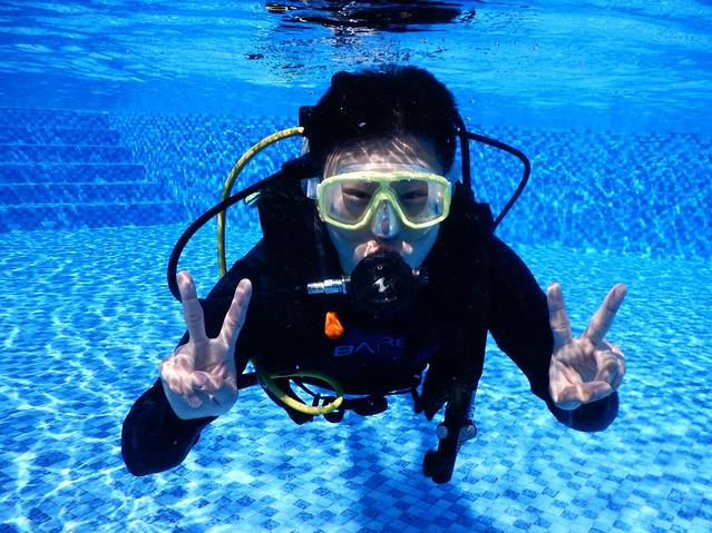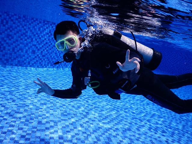 平静水域的练习在半山半岛酒店的泳池进行,包括装备准备和面镜除雾,如水、穿戴装备和配重,下水前的安全检查,在水面上将BCD充气、泄气,介绍水中呼吸,调节器排水和寻回,清楚部分面罩内的积水,下潜和平衡空腔,水底游动,手势,使用压力表和监测空气量,上升及监理正浮力,出水最后是装备的拆卸。可能记得不全,但大概就这些吧。