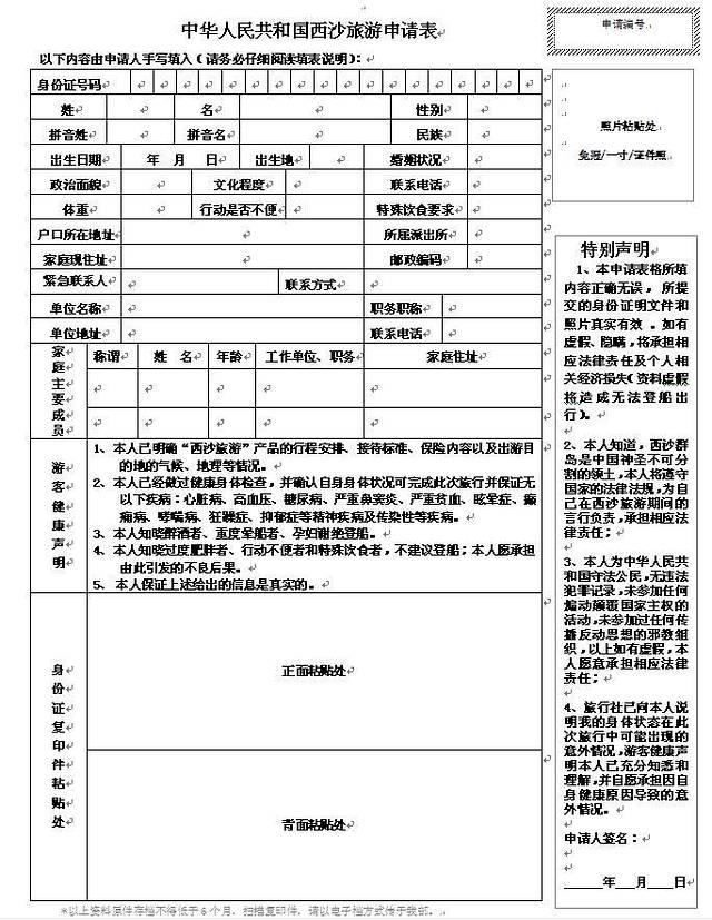 还有,去西沙前需要手写填好这张表,在旅行社报完名后他们就会把这张表连同出团通知一起发到邮箱里,然后逐项填写后拍照再给旅行社发回去就可以了。目前西沙旅游只对大陆且无违法犯罪记录的公民开放。