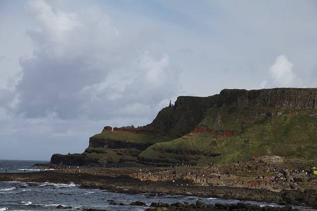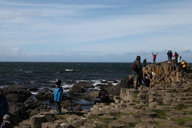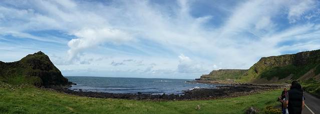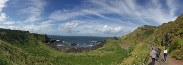 从游客中心出发全景拍摄巨人堤入口,有摆渡车可以乘坐,但更多的人选择边听讲解器讲解,边走路观景。照片上路的尽头是个风口,风吹在身上挺冷的,一路上没有遮挡,回来时在风口遭遇阵雨,雨点很大,幸而穿着冲锋衣,不然样子肯定很狼狈。