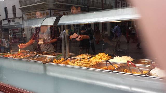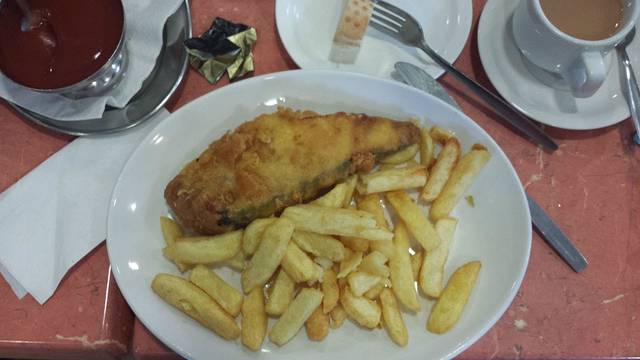 Fish & Chips:鱼和薯条。很大一份,刚吃时感觉不错,鱼肉挺鲜嫩,最终还是因为太油腻无法吃完。这是大不列颠之行少有的几张餐饮照片之一,实在没得拍。