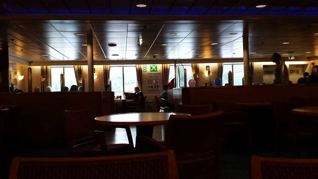 行程约两个小时,渡轮上有午餐出售。船挺大,有几个活动舱供乘客选择,有咖啡吧的船舱人最多。