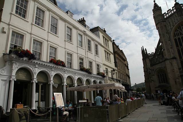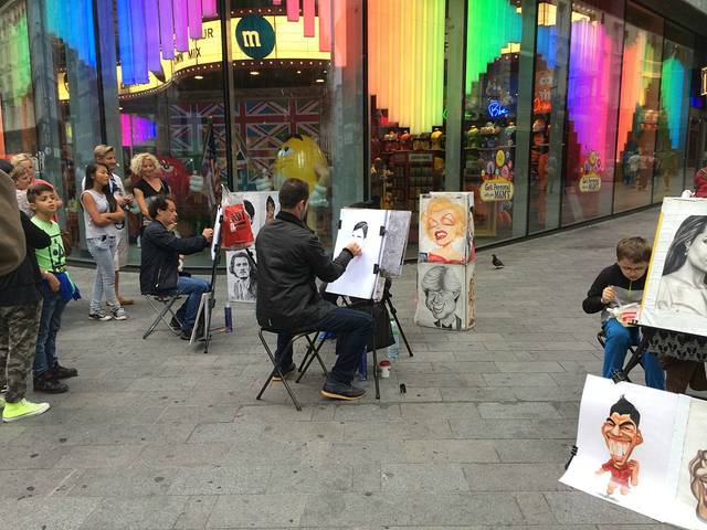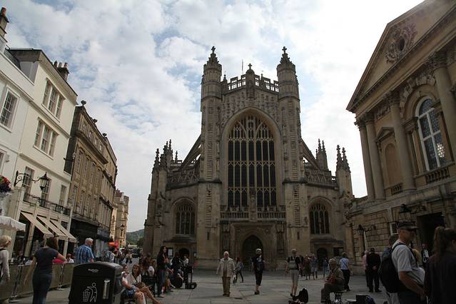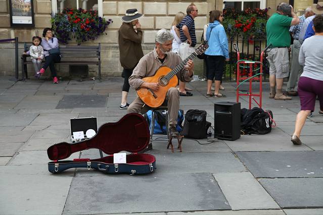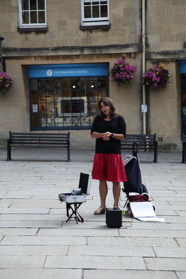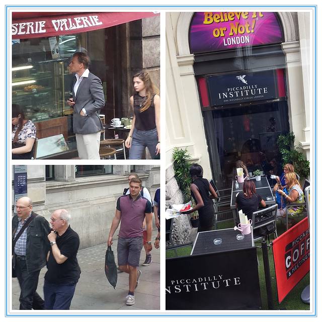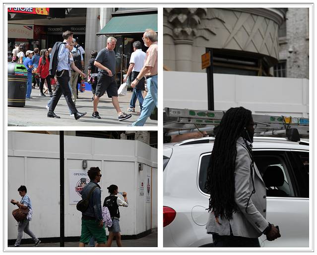 我们离开小街到大街上继续等大巴,照片是小街与大街的交接处,墙边站着几个穿着非常正式、传统的英国男人,这是我从远处用相机镜头拉近了拍的。当我们走到这里时,这群绅士们从对面楼房的一个小门里鱼贯而出,人数比照片上多不少,因为穿着太正式,让我们很是吃惊,后来知道那个小门是剧场的边门。