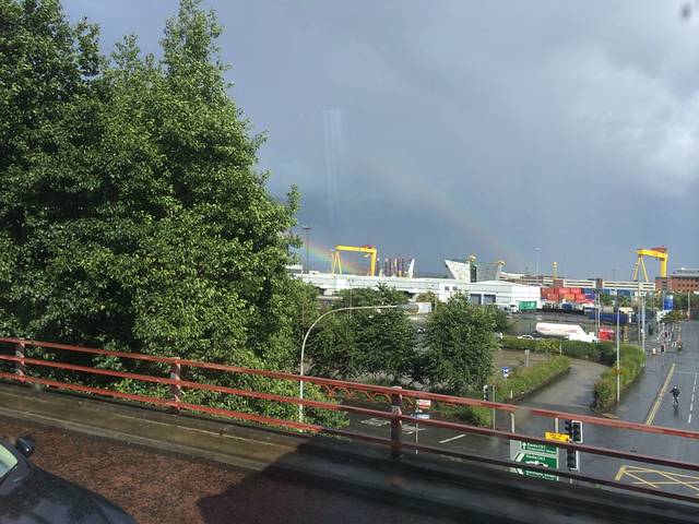 中途大雨滂沱,快到贝尔法斯特时,车被堵在高架桥上,意外发现彩虹(下面那个色彩清晰的),还有霓(上面那个色彩分布与虹相反,相对暗淡的)。