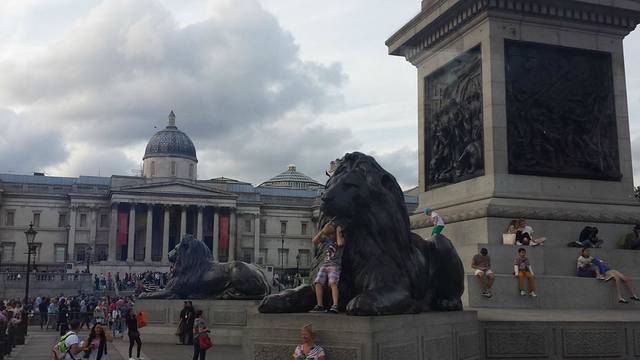 特拉法尔加广场是为纪念著名的特拉法尔加港海战而修建的。广场最突出的标志是南端的纳尔逊纪念柱,高53米。此碑纪念着拿破仑战争中的海军上将,英国民族英雄霍雷肖·纳尔逊。柱顶是将军的铜像。柱底四周是四只巨型铜狮。西北角的“第四基座”一直空缺着,伦敦市政府在此轮流置放一些现代雕塑作品(蓝色的公鸡)。