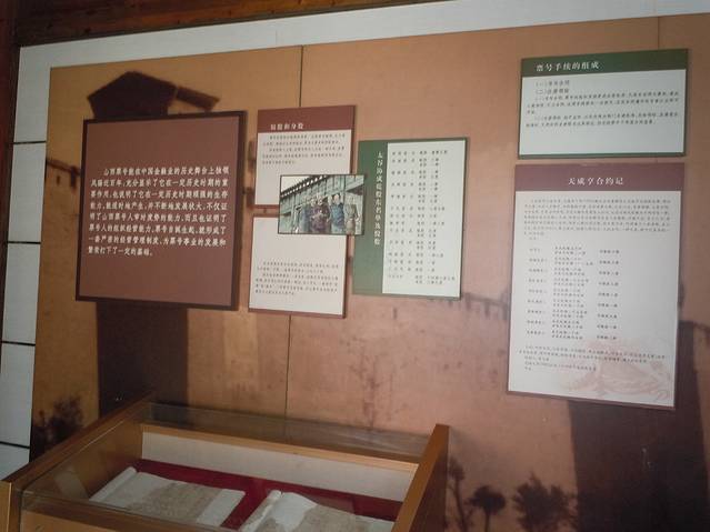 日升昌,中国历史上第一个票号,里面陈设着日升昌票号的日常办公及生活起居的住所,各大掌柜的介绍及日升昌的发展和票号兑换银票的规则。
