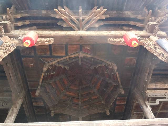看到这个八卦形的屋顶了吧,据说有八百年的历史了,在那个没有音响的时代,这里唱戏四周都可以听清,不得不赞叹古人的智慧。
