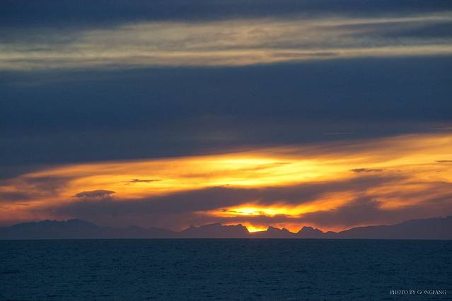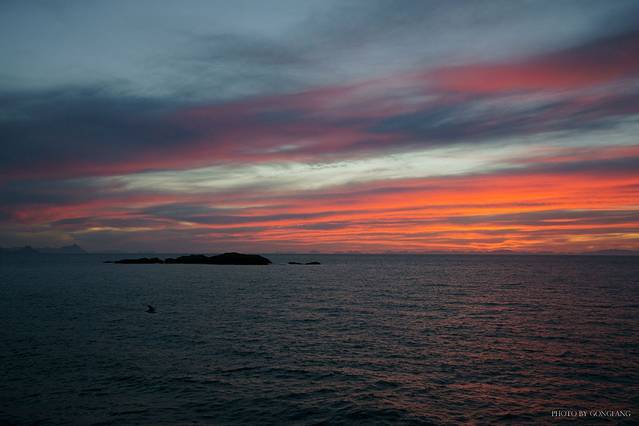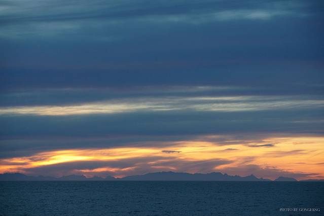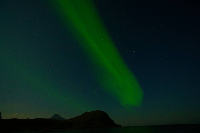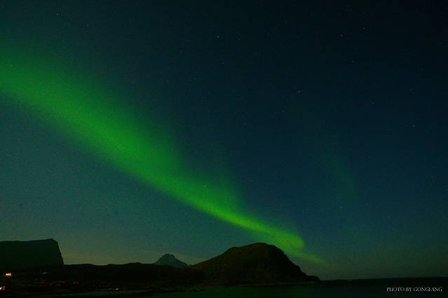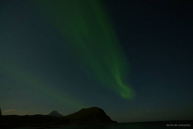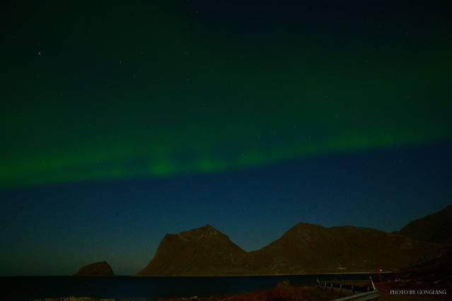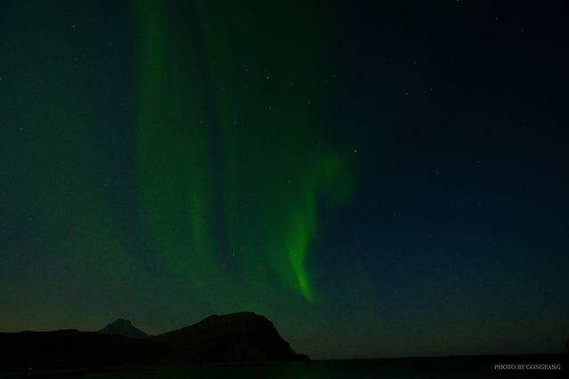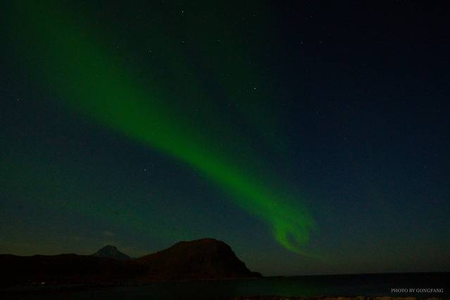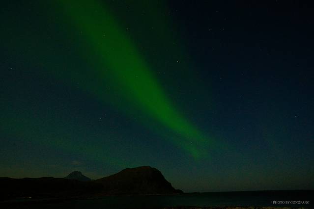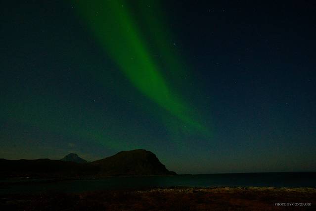 晚上Uttakleiv Haukland守候极光,这里的峡湾更靠北,一小片沙滩,天空开面更大,位置极佳,装备毯子,巧克力、热茶、脚架,球形云台方便左右移动,极光如约而至,远远的天际,先是一圈浅浅的光轮,漫漫散开,如绸带缎绫舞动。