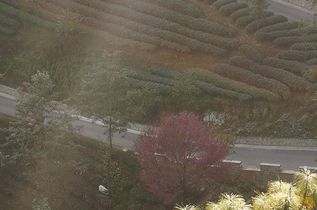 第二天一早,天边刚泛出鱼肚色,我就起来,等我整理完,几个摄影爱好者己不见踪影,自己就凭着感觉到二号景区去游览,来到这片神奇的土地上时,被这梦幻般的景色迷住了,那满峡谷的淡雾,如轻纱曼舞在山间游荡,那满山的樱花树在淡雾中若影若现,像一幅幅油画,真是美极了,当太阳从云缝中透过来时,霞光万丈,那樱花树在蓝天白云下亭亭玉立,在霞光照耀下泛着娇嫩的粉红色,和山上的茶树交相辉映,层层叠翠,红绿相间,是那样的醒目鲜艳,绚烂的冬樱花争奇斗艳,摇曳生姿。粉红色的花,白色的云雾,绿色的茶园,娇艳的樱花错落有致,那景色无以伦比,如同一棵棵红宝石缀落在绿毯上,美轮美奂,让人迷醉之间,远远望去,一株株樱花与层层茶田相得益彰,谱写着绿茶红樱相恋相守的浪漫乐章。真是美景藏在深山无人知,在这么一个深山峡谷中会有如此美丽的景色,此景美不胜收,构成一幅迷人仙境。望着那绽放的冬樱花,开得恣意,开得欢腾,如难得一见的繁英绚烂,就在这个冬天自由盛放。苍翠茶园相伴,幽幽山谷相守,此处正是最孤芳自赏的美好地方。若遇晨雾缭绕,只在迷蒙微光间泄露那红粉的娇俏,就像是欲出仍遮面的段誉口中的神仙姊姊,不需人识,只能偶遇。