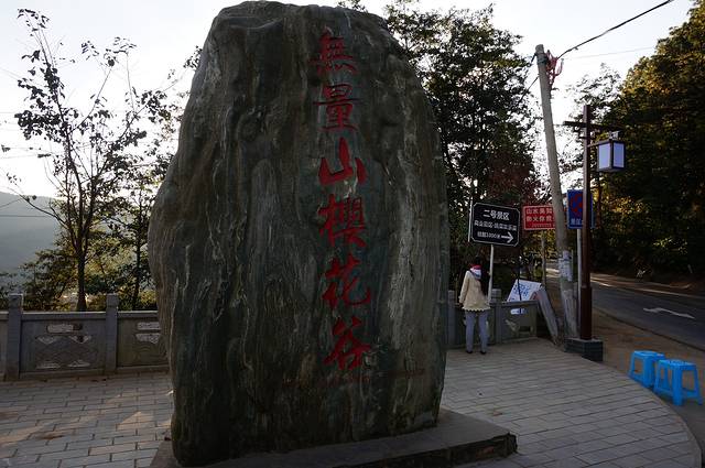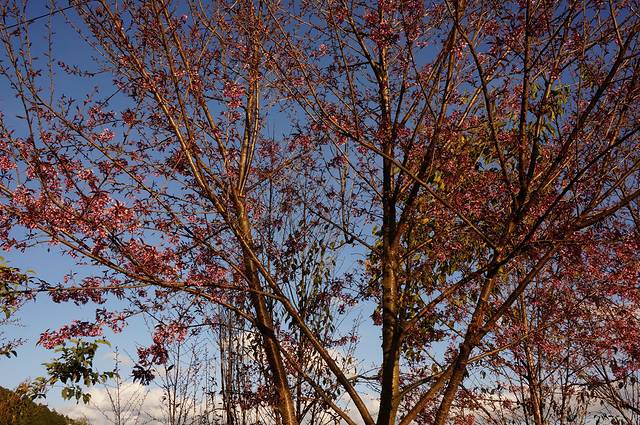无量山樱花谷,位于云南大理南涧县无量山地带的一片茶园里。 据说,无量山茶园里的樱花是2000年由台资企业“大理华庆茶叶有限公司”在发展茶产业过程中,引进种植的茶树覆荫树。原本是为了给茶树遮阳,谁知“无心插柳柳成荫”。每年的12月份,北方进入冰天雪地时,无量山山谷里的樱花却绚丽绽放,红樱花衬托着绿茶园,星星点点连成一片,蓝天、白云、红樱、绿茶,形成一道独特的风景线。因此,昔日的“蛇妖箐”变成了如今的“樱花谷”。据茶农们说往年,12月中旬,是樱花谷最灿烂的时节。但今年的花期比往年提前,11月中旬就已开花了。当地茶农告诉我们,每年樱花的盛花期为一个月,我们是11月26到的,我感觉还是早了几天,还没有到盛花期。驴友告诉我说28号樱花节开幕,但是景色确实很美。遍野冬樱花开放,构成一幅迷人仙境。走入樱花谷,人们便被绿野中五彩缤纷的樱花所吸引,走进茶园,那满树云樱,若隐若现的嫩叶,总会让摄影爱好者为主的游客如醉如痴,他们像蜜蜂,似蝴蝶,穿梭在樱花林间,或拍照,或慢步,或追逐嬉戏,让樱花的灿烂托起自己难以抑制的笑脸。樱花谷面积约2000亩,据说总共有一万多棵,成三片分布。构成一幅无量山樱花谷人间仙境。樱花谷免费为游客开放,不收费,景区配备有观景台,停车场,冬天黑的早,还没有尽兴,天就黑了,回到住处,在农家点了一盘火腿,一个素菜,一个青菜汤65元。晚饭后,明亮,皎洁的月亮升上了山头,给大山洒落一片曚昽的银光,星空很灿烂,满天的星星,一闪一闪的,照了几张照片,相机不行,技术也不好,不满意,很久没看到这么多的星星了,在樱花树下,在生态氧吧中尽情呼吸,看夜空中最闪亮的星星,那是心灵和自然最纯粹的交流。但山上风大,无量山的海拔也不低,昼夜温差很大,看了一会月光,星星,感觉冷了就回屋,准备第二天早起,同住的有几个专们从事摄影也准备拍日出。