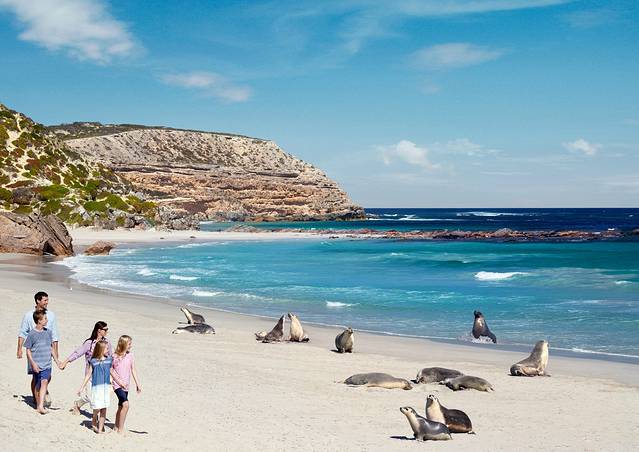 海豹湾以其庞大的稀有动物群——澳洲海狮群而著称,这是澳大利亚唯一一处游客可与海豹在沙滩上近距离接触的地方。自1803年开始,这里便有了生态记录,在20世纪前半叶,捕捞鲨鱼船曾任意捕杀海狮和海豹用作捕杀鲨鱼的诱饵,而因为海豹湾附近的海域水下有暗礁,海船无法靠近,这里的澳洲海狮才幸免于难。1954年,随着海豹湾水域保护区的成立,岛上的海狮群从此可以平安定居,繁衍后代。目前,这里共有海狮约600头,它们极通人性,对于游客们漫步在它们其中,表现得相当大度,当面对游客的镜头时,会摆好姿势,非常合作地为游客呈现一副生动的图画。