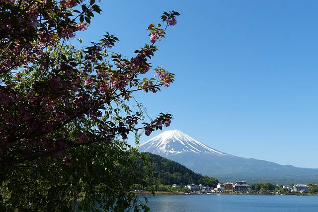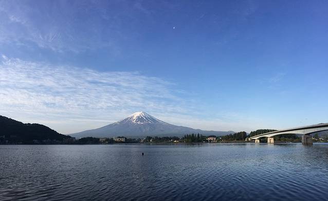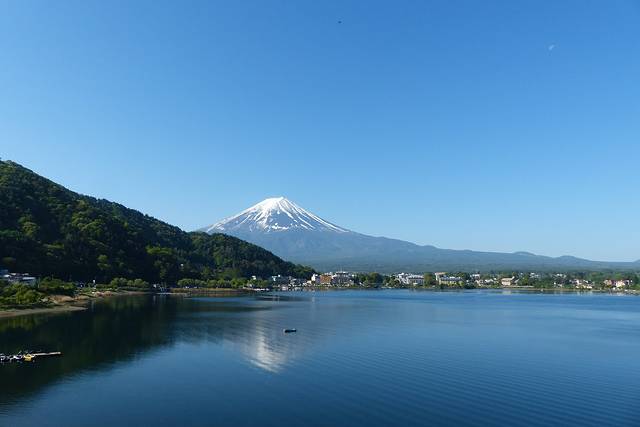 天空晴朗、湖面平静的时候,能看到倒映在河口湖里面的富士山,这就是著名的逆富士。